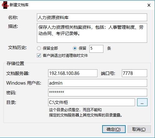 - 弹出“新建文档库”窗口,输入文档库的名称、描述、文档历史、存储位置等信息。若网盘服务配置工具窗口中选择了“客户端连接时要求使用 Windows 身份验证”,则创建文档库时需要输入网盘服务器windows账户及密码。(若未选择windows身份验证则可不输入windows账户及密码)。