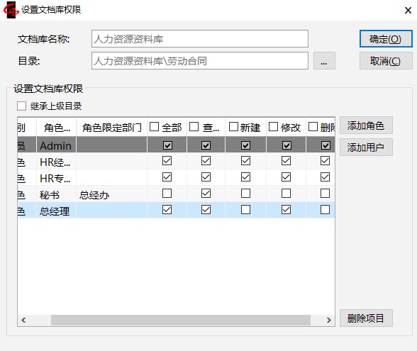 5.若勾选了“继承上级目录”,则右侧的【添加角色】、【添加用户】、【删除项目】都是灰掉的,不可以操作且不可修改权限和角色限定部门;若把“继承上级目录”的勾选去掉,则此三个按钮都可以操作。