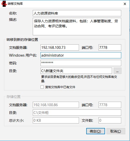 如果只是机器名或ip地址的改变,实际物理存储位置不变,或者用户已经在系统外手工把文档库拷贝到了新指定的目录,则不需要勾选“复制文档库中已有文档”。否则的话,要勾选“复制文档库中已有文档”。