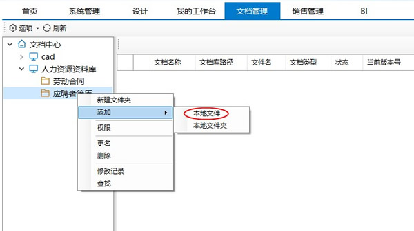 - 选中某个文档库或其下的目录,右键【添加】-【本地文件】。