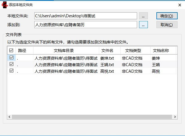 3.选中的本地文件夹及其下的各级子文件夹中的所有文件显示在窗口下半部分的列表中,针对每个文件,列出其本地路径、即将添加到的文档库目录,以及文件名。所有列出的文件默认都是被勾选的,如果某些文件不想添加到文档库,可以取消勾选。如果文件夹已存在,则往该文件夹上传新增加的文件。上传时可自动识别非CAD文档、AutoCAD、Pro/Engineer、SolidWorks文件类型。