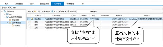 5.回到文档管理栏目,会看到这些被签出文档的状态显示为“本人本机签出”,同时显示其本地副本(即签出文件在本地的文件标识符)。