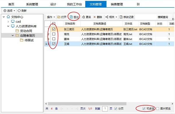 - 在右侧的文档列表标题的分页栏中,勾选“可多选”,列表中每个文档的左侧出现复选框。