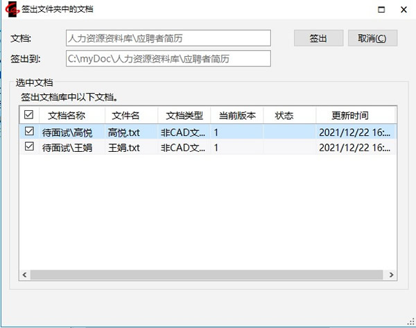 - 弹出“签出文件夹”窗口,列出选中目录及其下的各级子目录中的未签出文档。