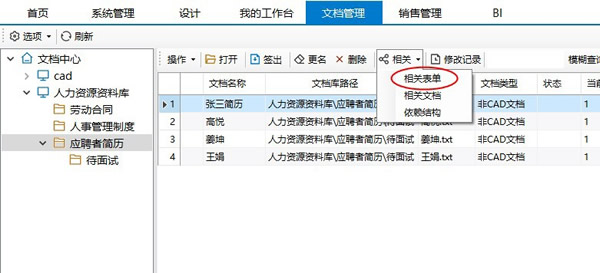 在CAD服务器2024中我们可以设计模板,基于模板来填报一份份表单,表单反映的的是业务数据;针对一项业务,除了相关的数据,还可能有相关的文档。例如,一个新员工入职,要填“员工登记表”,这是表单,同时,还要把这个新员工的简历、劳动合同等归档保管,这是文档。在Excel服务器中,我们可以建立我的工作台中的表单和文档库中文档的相关关系,当查看表单的时候,可以参照相关文档,查看文档的时候,也可以参照相关表单。