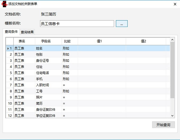 4.点击【添加相关表单】,弹出下面的窗口,在模板名称那里选择模板,在“查询条件”选项卡上输入查询条件,就像在我的工作台中查找一样,点【开始查询】,窗口自动切换到“查询结果”选项卡,显示符合条件的表单。当然,也可以不输入任何条件,这种情况下点【开始查询】,在“查询结果”选项卡上显示的就是指定模板中的全部表单。