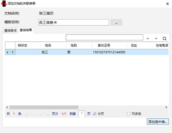 5.在“查询结果”选项卡上选中和当前文档相关的表单(可以同时选中多个),点击【添加选中表】。系统提示“添加成功”,然后回到“相关表单”窗口上,显示刚刚添加进来的相关表单。