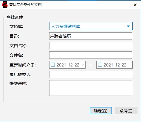 在文档管理栏目中,选中任一节点右键,点击【查找】按钮,弹出下面的窗口,输入查找条件后,点击【确定】,回到文档管理栏目,在文档库目录树的最下方,将出现一个“查找结果”节点,选中这个节点,右侧的文档列表中列出所有符合条件的文档。