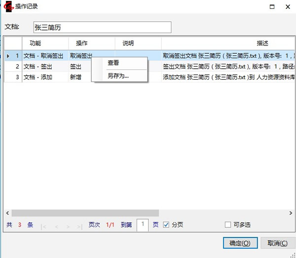 我们知道,文档库中的文档,是受版本控制的,文档库每次修改后,版本号都会增一。在“操作记录”窗口中显示的文档修改记录,其背后是文档的各个历史版本,选中其中的某个历史版本,点击右键,会看到两个弹出菜单,点击【查看】,会打开该文档的此版本,查看其中的内容;点击【另存】则会将该文档的这个历史版本下载到本地。
