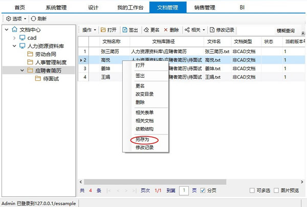 在文档管理栏目中,右侧列表区选中一份或多份文档,如下图选中一份文档,点击右键,选择菜单【另存为】,弹出选择存放路径窗口,选择路径后【确定】,则将选中文档保存到了指定路径中(另存过程中会有进度条显示)。