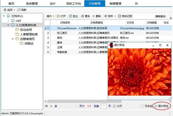 在文档管理栏目中勾选工具栏中的【图片预览】后选中在预览的图片文件,即可预览对应的图片。